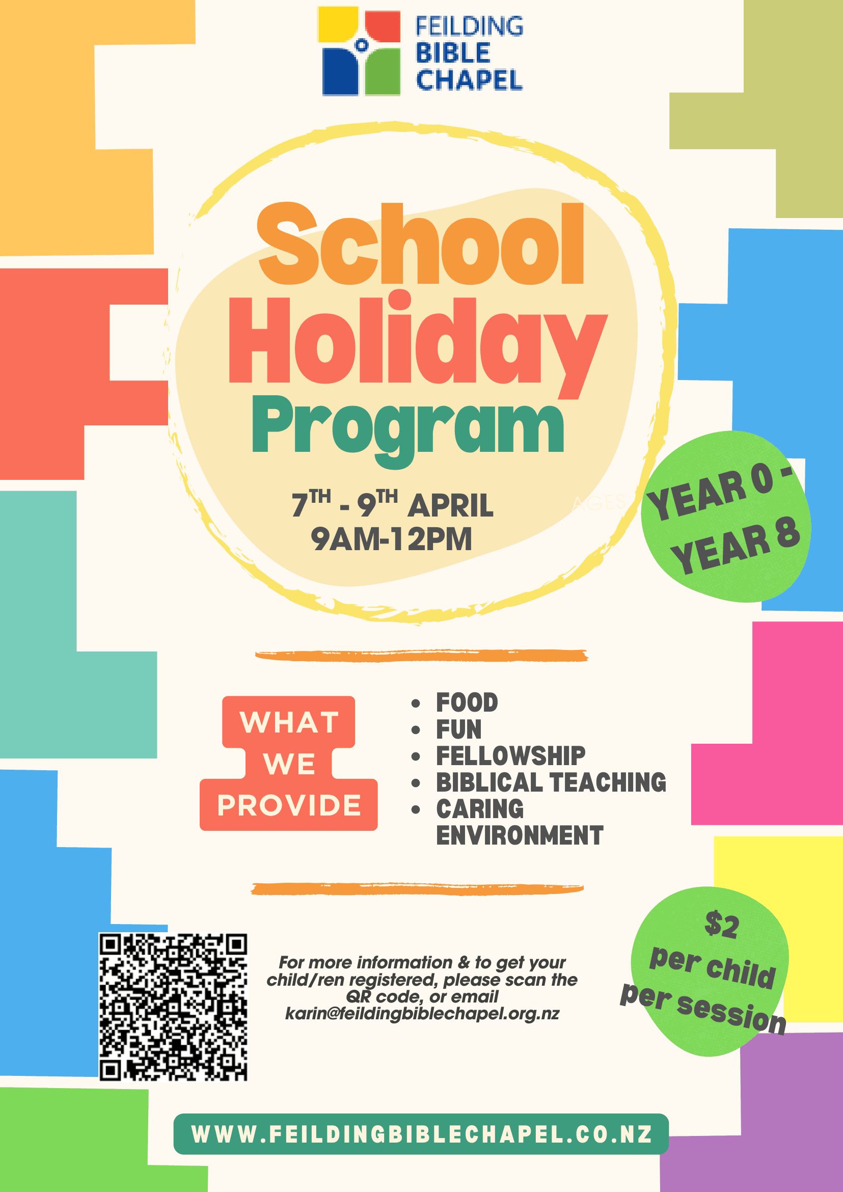 For more info about our school holiday program email karin@feildingbiblechapel.org.nz